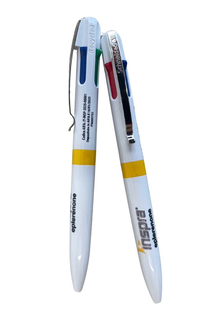 In occasione del lancio di un nuovo farmaco mirato ad agire su quattro aspetti fondamentali della patologia, abbiamo proposto un gadget simbolico e sostenibile perfettamente coerente con i valori ESG del cliente. La penna 4 inchiostri rappresenta metaforicamente l’azione quadrupla del farmaco, mentre i materiali sostenibili dimostrano l’impegno dell’azienda verso la responsabilità ambientale. Realizzata con 82% di plastica riciclata, produzione europea e inchiostri atossici, la penna comunica simultaneamente efficacia scientifica e responsabilità sociale.