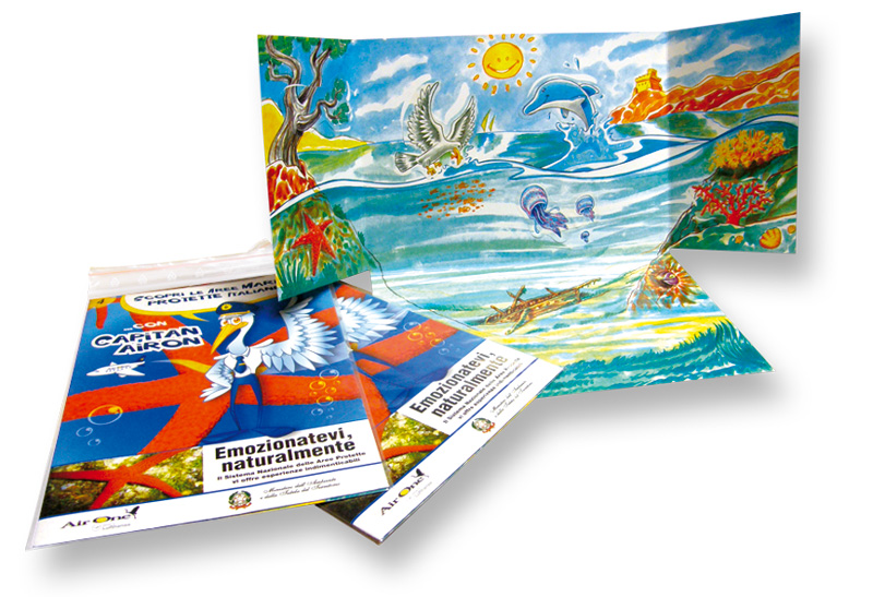Abbiamo ideato “Capitan Airon”, in collaborazione con il Ministero dell’Ambiente: un personaggio guida che accompagna i bambini alla scoperta degli habitat naturali italiani attraverso adesivi stacca e attacca riutilizzabili.