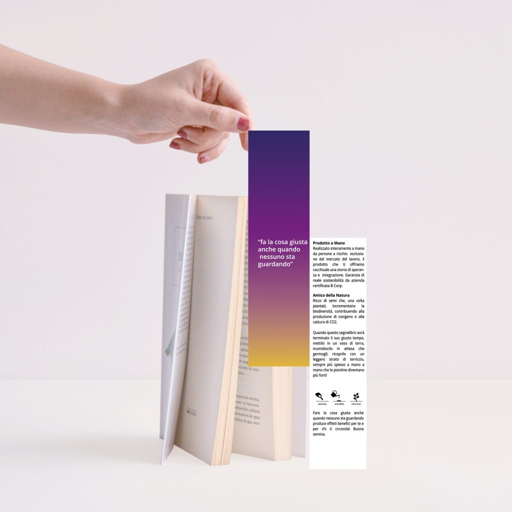 Abbiamo progettato un segnalibro che fosse insieme strumento pratico, messaggio etico e simbolo di crescita, sviluppando una comunicazione che raccontasse anche il processo di realizzazione.